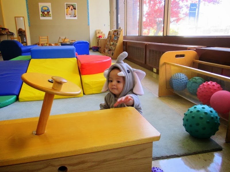 At Monday's class, we dressed up the little beans for Halloween, and thankfully, Noah liked wearing his costume. He wasn't a big fan of the suit when I tried it on him for the first time a month ago, but maybe it was too warm out and mommy was just annoying by stuffing him into a fleece elephant outfit.